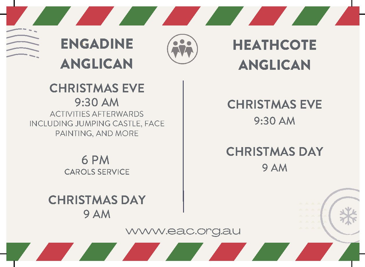 Celebrate Christmas 2023 Sunday 24 December 2023 9:30 am Monday 25 December 2023 9:00 am Engadine Anglican 4 Waratah Rd Engadine NSW 2233 Australia (map) Google Calendar ICS