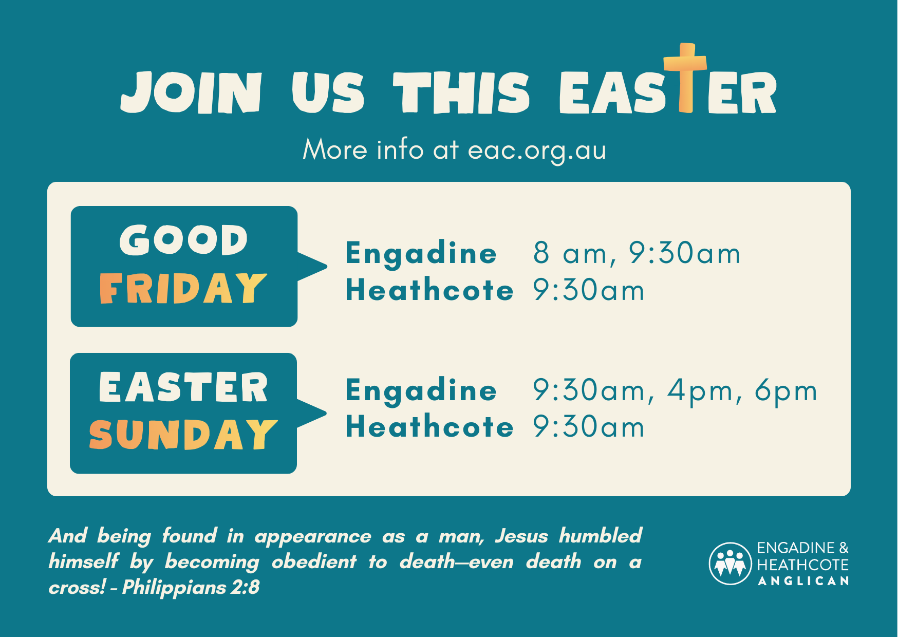 Easter 2026 Friday 3 April 2026 9:00 am Sunday 5 April 2026 10:00 am Engadine Anglican 4 Waratah Rd Engadine NSW 2233 Australia (map) Google Calendar ICS